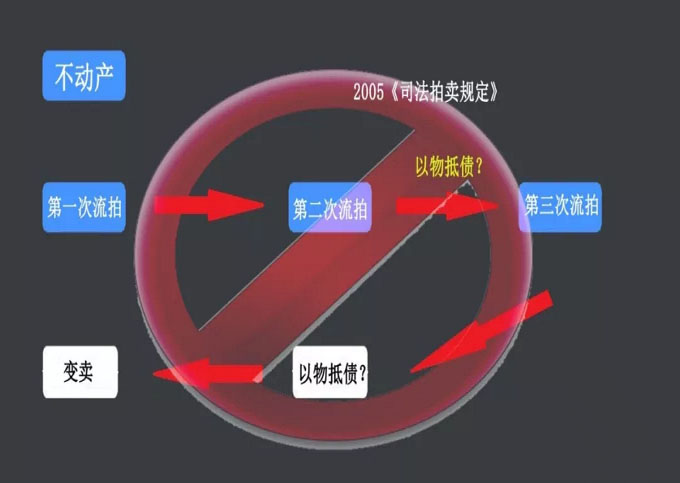 針對不動產(chǎn),司法拍賣一共可以進行三次,三次流拍后才進入變賣程序,從不動產(chǎn)第二次流拍開始,經(jīng)過第三次拍賣,直到變賣程序終結(jié),“以物抵債”貫穿于整個過程中。